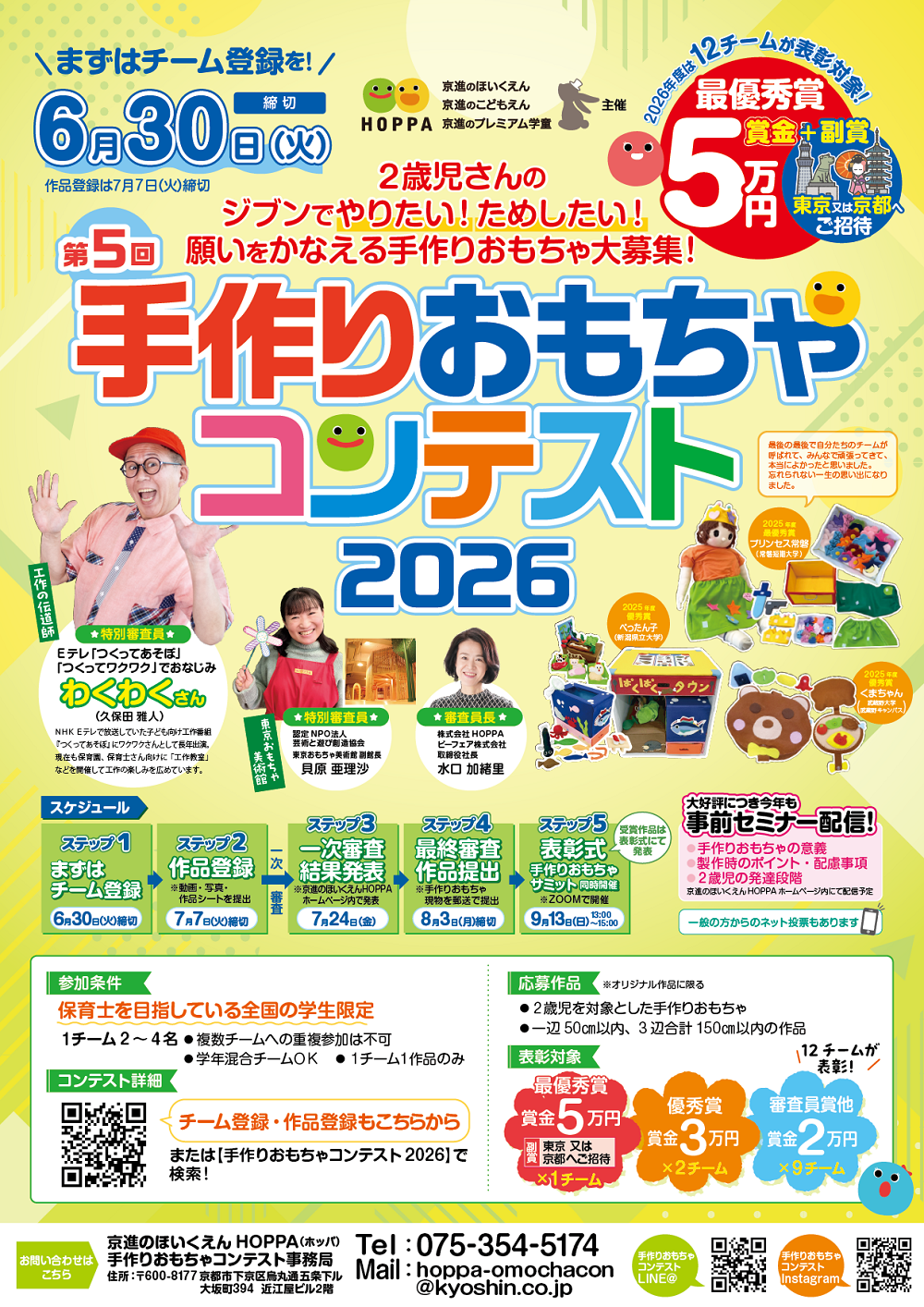 HOPPA最新ニュースフェア/説明会/イベント情報手作りおもちゃコンテスト 手作りおもちゃコンテスト2026 開催決定! 2026/04/03 #安全、保育#初心者#新卒#手作りおもちゃコンテスト#HOPPA ★全国の保育養成校に通う学生を対象にした、「手作りおもちゃコンテスト」を今年も開催します!詳細は下記のリンクをご覧ください!ご応募お待ちしております!!https://keceg.jp/2026/03/25/omocha2026/