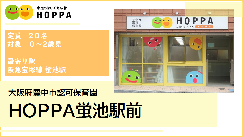 京進のほいくえん HOPPA蛍池駅前の最寄り駅は、阪神宝塚線と大阪モノレールの2線がとまる蛍池駅。 駅チカ3分のマンションの1階にある保育園です。 電車で通勤する職員も多く、便利!と好評。 0歳児から2歳児のみ、定員20名の少人数を預かる小さな保育園です。 家庭のような環境で、保育士はお母さんお父さんになって、メリハリのある毎日を送るよう心がけています。 園庭はありませんが、周囲の環境は最高! 大阪国際空港が近いので、飛行機、モノレールに電車、近くの消防署では救急車や消防車…とよりどりみどりの乗り物が見放題! 公園も近所にたくさんあり、目的に応じて選べるほどです。 当園では知育timeを大切にしています。 子どもたちが楽しみながら、考える基礎が身につくよう、教材にもこだわり、工夫して取り組んでいます。知育timeが始まると、泣いていた子もピタリと泣き止み、真剣そのもの。 その姿には嬉しくなります。 子どもたちのいきいきした表情に出会えますよ!