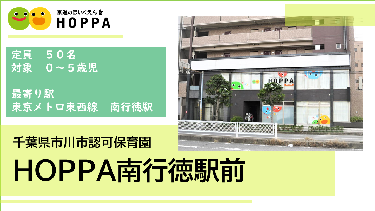 26新卒保育士求人【保育士・正社員】市川市(南行徳駅)★10月より月額手当が増額!!★入社お祝い金制度あり♪【HOPPA南行徳駅前】