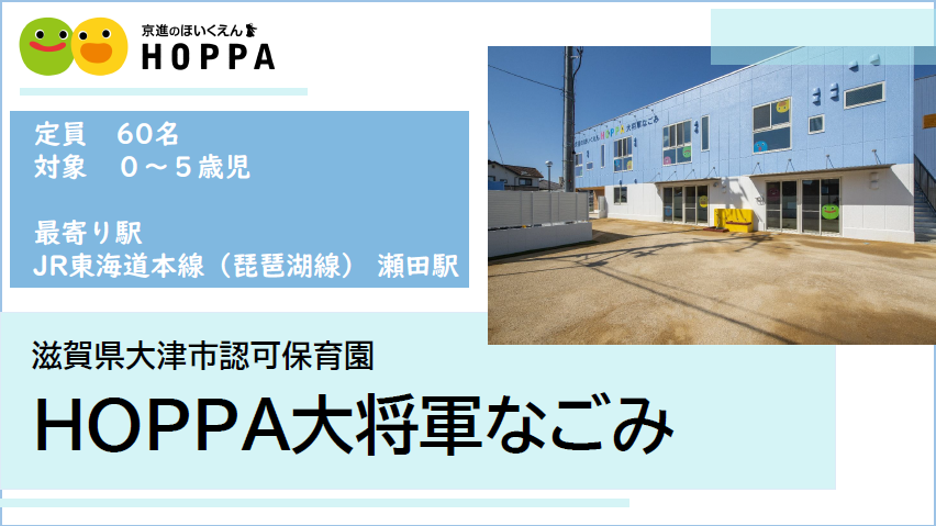 - 【HOPPA大将軍なごみの紹介】《JR瀬田駅から徒歩9分》2020年4月開園した京進グループの認可保育園です。1クラス10名前後とアットホームな環境を活かし、子ども達の個々の発達段階を丁寧に見つめ、日々の小さな成長を見逃さず、その子にとっての相応しいタイミングで保育者が援助することで、子ども達が自ら伸びようとする力を大切に育んでいきます。オープニングスタッフだからフラットな環境でスタートできますよ。(園児60名)(職員数:施設長1名、保育士15名、看護師1名、調理員1名)