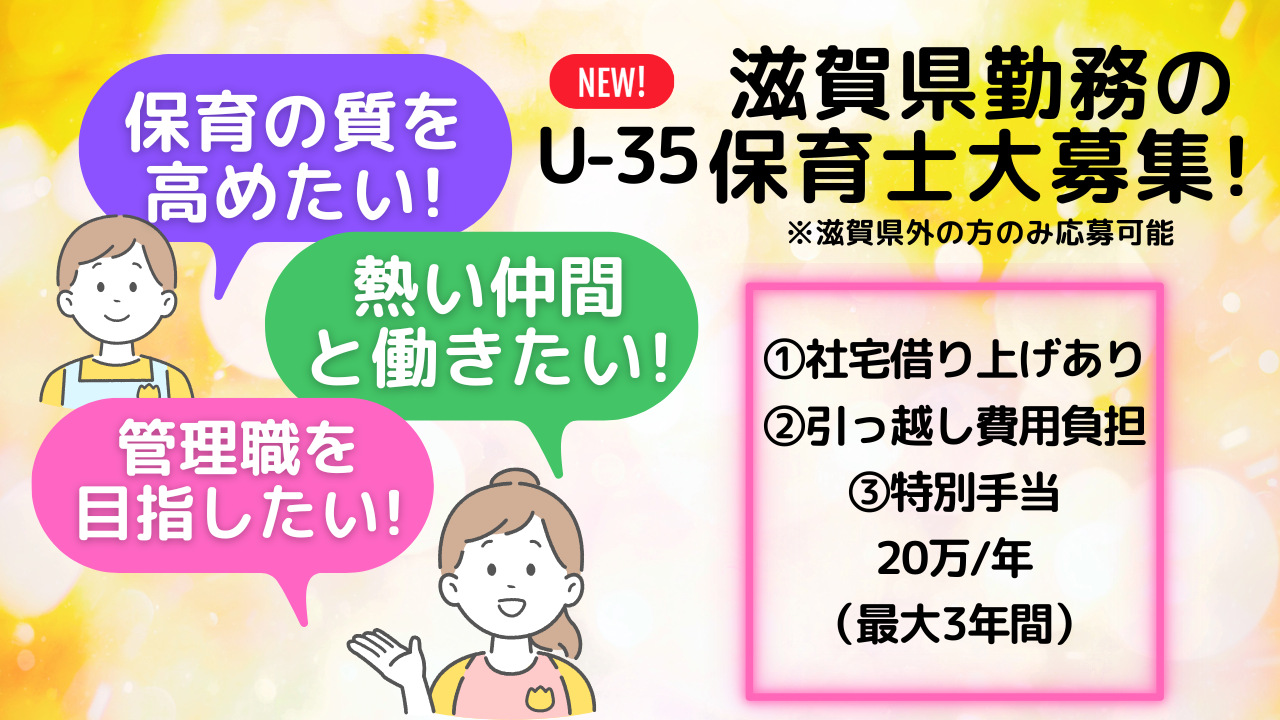 - 普段は配属園にて保育士として担任業務等を担って頂きます。 滋賀県のHOPPAがある地域は、京都・大阪への通勤圏内となっていることもあり、現在多くの待機児童が出ています。 ぜひあなたの力を滋賀県で発揮していただけませんか? 社宅借り上げ制度・引っ越し代費用援助があるからお住まいの心配なし! さらに、勤務開始から3年間、毎年20万円の特別手当支給! 滋賀県内にHOPPAは18園あり、 様々な規模や形態の園があるHOPPA随一のHOPPA随一のエリアです。 多様な経験を実感していただけること間違いなしです。 滋賀県は京都や大阪などにも近くお休みの日には気軽に出かけることができます。 県内は自然豊かな地域もありますし、アウトレットや大規模モールなどでショッピングやグルメを楽しむこともできます☆ びわこだけじゃない魅力たっぷりの滋賀を一緒に探してみませんか?